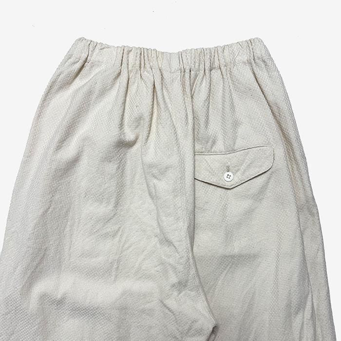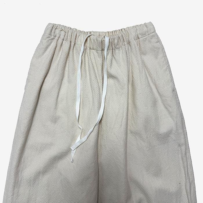 ゴーシュでは新素材のコットンドビー素材のワイドパンツです。ゴーシュの中では一番太いシルエットのわいどパンツです。ゴーシュの中でも最もワイドなシルエットのパンツです。深めの股上とゆったりとしたシルエットで、リラックス感がありながらも、9分丈なのですっきりとした印象です。ウエストはゴム仕様で、内側の紐で調節できるためお好みのフィット感に合わせられます。生地は縦糸と横糸の撚りを変えて織られた、まるで小紋のようなユニークな表情を持つ生地が特徴です。厚みがありながらも柔らかく、美しい落ち感を生み出します。洗練された印象ですが、心地の良いはき心地です。