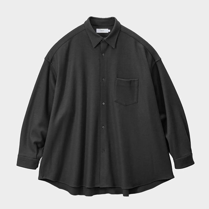 上質なウールスムースを高圧でミルド加工し、フランネルのような表情に仕上げたレギュラーカラーシャツ。圧縮による適度なハリと柔らかさを備え、スケールオフ加工でハンドウォッシャブルも可能。上品な光沢としなやかなドレープが魅力。冬に最適なウォーム感のあるオーバーサイズフィットで、日常から上質を感じられる一着に。