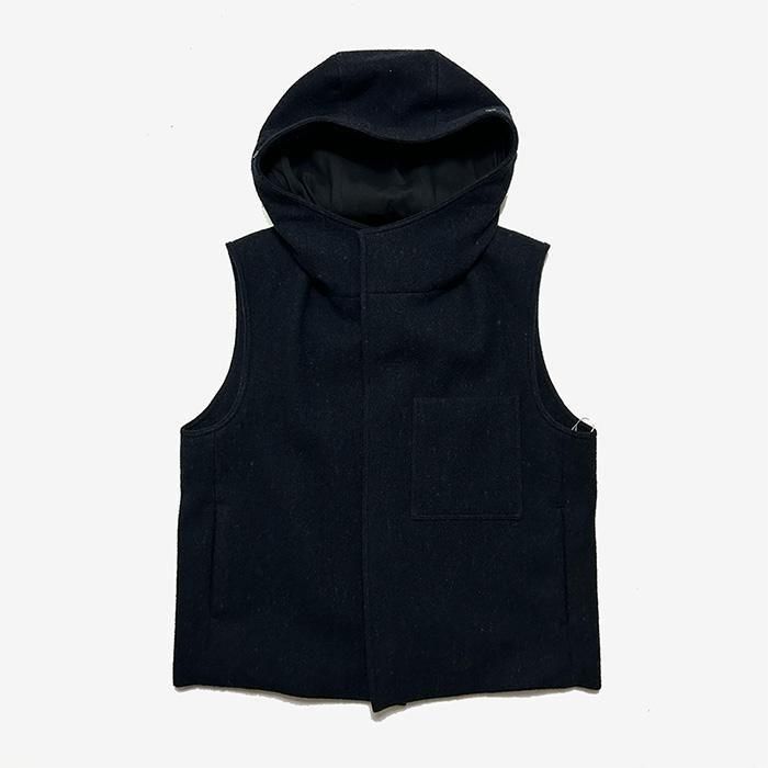 軽くてやわらかい、ふかふかの生地感のベストです。 強く打ち込みすぎずに織った生地に縮絨加工を施すことでウール100%なのに軽く、やわらかな肌触りです。襟上まで閉じても口元に当たりにくい設計で、見た目すっきり・着心地快適。ゆったりとしたシルエットで重ね着もしやすいです。 冬のワードローブに、毎日手に取りたくなる一着です。