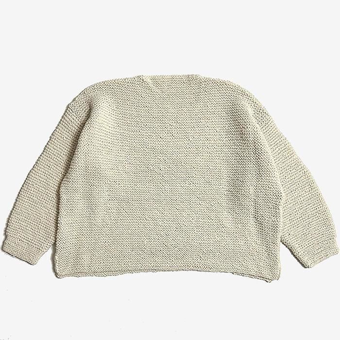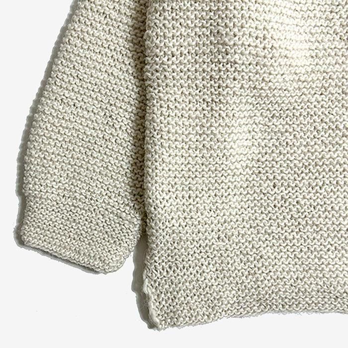 柔らかさとぬくもりに全身が包まれる、アルパカウールの手編みクルーネックニット。 ペルーの熟練職人が一枚ずつ丁寧に編み上げた、完全ハンドニットです。 編むのに時間と技術を要する“ガーター編み”が生み出す、立体感のある表情とふんわりとした風合いは、他にはない特別感。 長めの袖は、すぼまった袖口で手首にしっかりとフィットし、動きやすさと防寒性を両立。 ドロップショルダーのゆったりとしたシルエットながら、丈感はすっきり。ボリュームのあるボトムとも好相性で、バランスよく着こなせます。 アルパカ特有のふんわりとした肌触りと高い保温性で、寒い季節も快適です。 見た目にも着心地にも、贅沢なあたたかさを感じられる一着です。