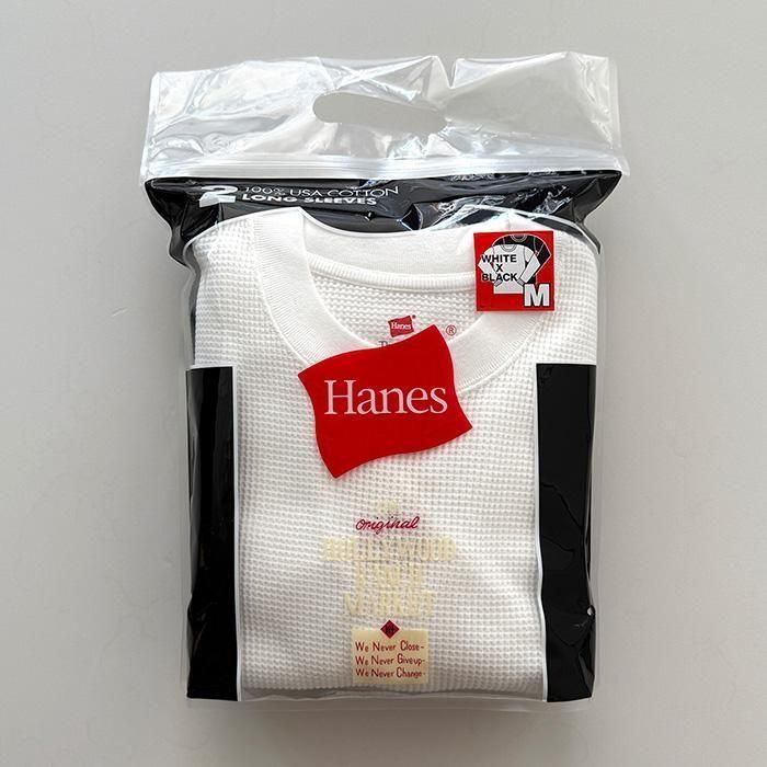 スペシャルコラボレーションパックTシャツです。ご愛顧いただいているシリーズに、新たにロングスリーブサーマルが登場しました。 アメリカ産の綿をオープンエンドと呼ばれる空気圧で撚り合わせることで、繊維の間に空気を含んだふっくらとしたボリューム感が特徴の糸を使用しています。ドライながらも柔らかく、肌触りの良い生地です。 程よくムラのあるナチュラルな風合いはデイリーユースにぴったりです。背裏部分にプリントしたHanesとHRMネーム、左袖に施した「HRM」の刺しゅうがアクセントとなっています。 ※海外生産のため、サイズやプリント位置に多少個体差があります。リューム感が特徴の糸を使用しています。ドライながらも柔らかく、肌触りの良い生地です。 燃焼時のCO2排出が少ない「グリーンナノ」素材をパッケージに採用しました。小物入れ等として再利用可能なシングルジップ仕様です。デザインは、Hanesの1970'sアーカイブからインスピレーションを受けた、オリジナルデザインになります。