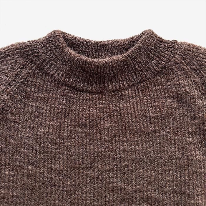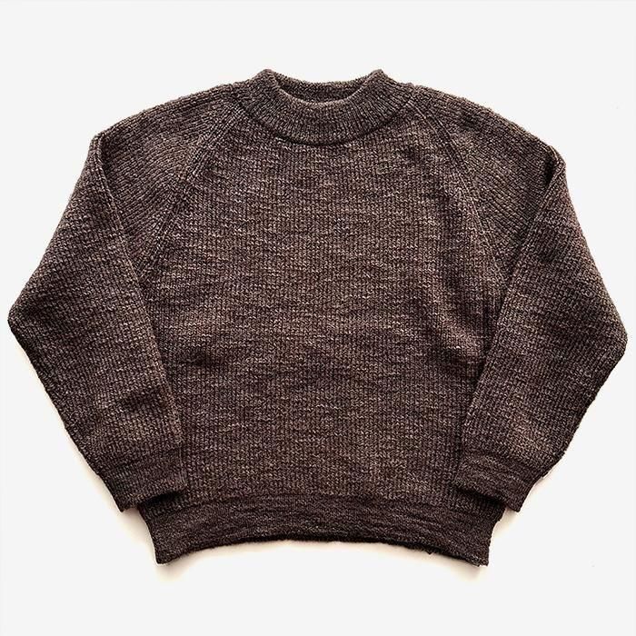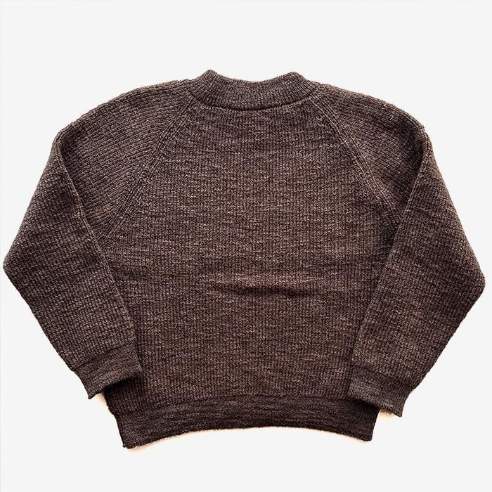 南米ウルグアイ産のノンミュールジングウールを太番手のスラブ糸に紡ぎ、リブ部分を除いて全体を畦編みで仕上げています。スラブ糸の嵩高性により、ざっくりとした表情ながら軽やかなボリュームを実現しています。ミュールジング(羊の臀部の皺に病原虫が付着するのを防ぐため、無麻酔で皮膚や肉の一部を切除する行為)を行わない原料を採用し、羊への負担を軽減しています。