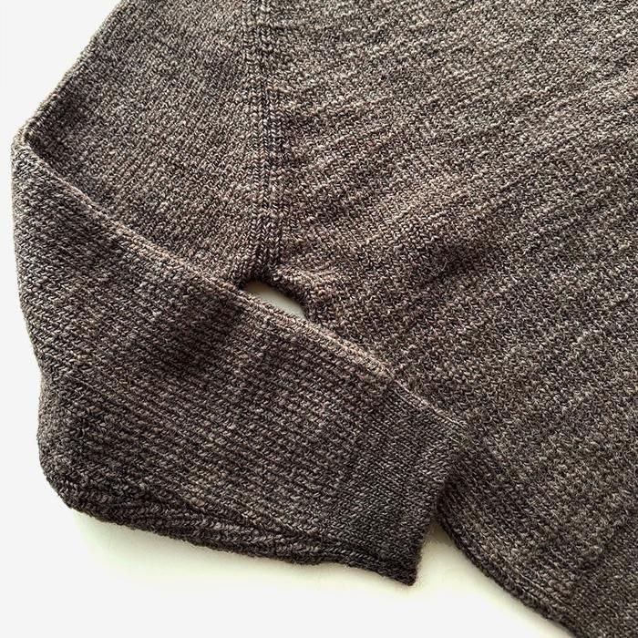 畦編み特有の立体的なボリュームを活かした、身幅にゆとりをもたせたシルエットです。インナーとしてはもちろん、アウターとして中に厚手のレイヤリングをしても窮屈さを感じさせず、秋冬の着こなしに柔軟に対応します。日常の道具としての機能性を意識しています。