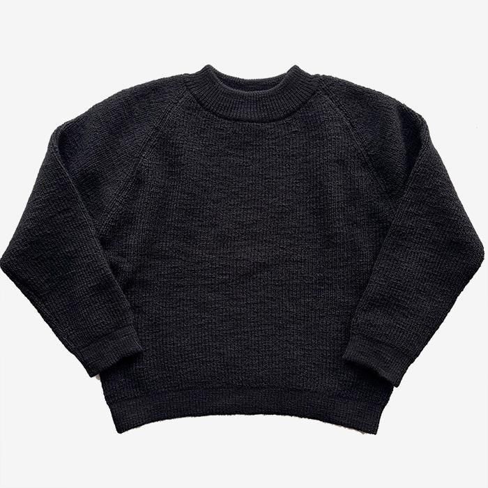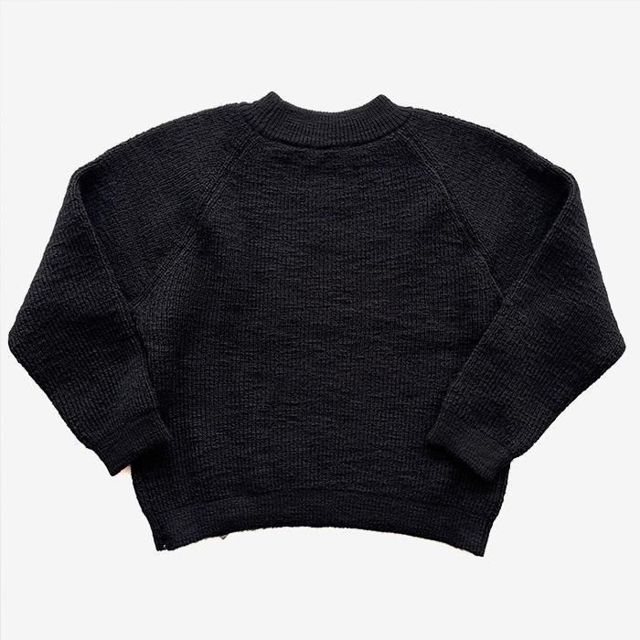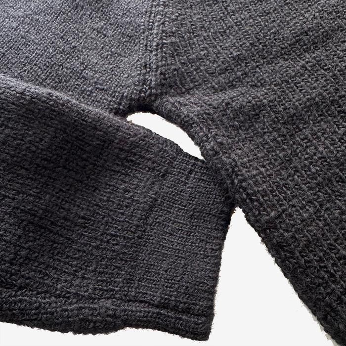 南米ウルグアイ産のノンミュールジングウールを太番手のスラブ糸に紡ぎ、リブ部分を除いて全体を畦編みで仕上げています。スラブ糸の嵩高性により、ざっくりとした表情ながら軽やかなボリュームを実現しています。ミュールジング(羊の臀部の皺に病原虫が付着するのを防ぐため、無麻酔で皮膚や肉の一部を切除する行為)を行わない原料を採用し、羊への負担を軽減しています。