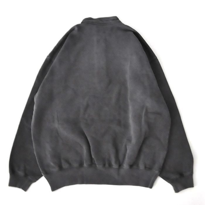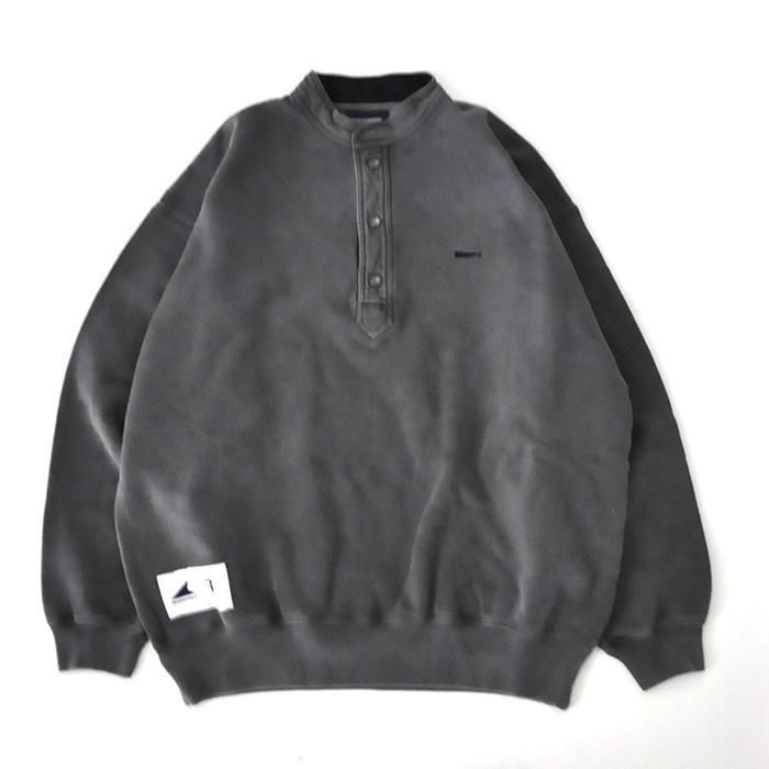 厚手のコットン裏毛を使用し、前襟にスナップボタン留めのハーフプラケットを設えたDESCENDANT定番のプルオーバースウェットシャツ。襟裏の当て布はそれぞれ濃い同系色、ピグメントダイ加工によるくすんだブラック、ネイビー、ブルーを3色展開。右前裾にサイズを表示したCETUSの織りネーム付き。