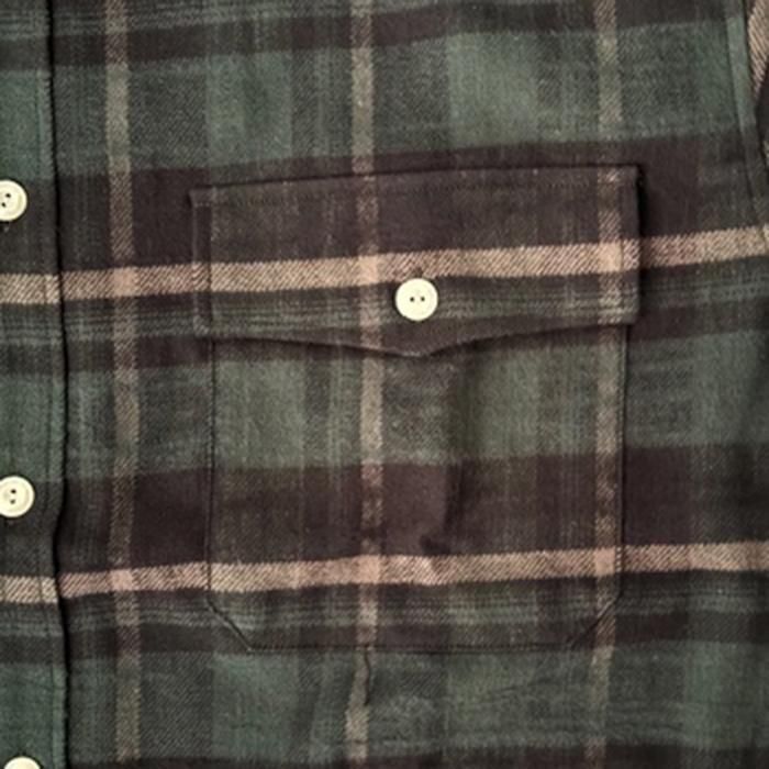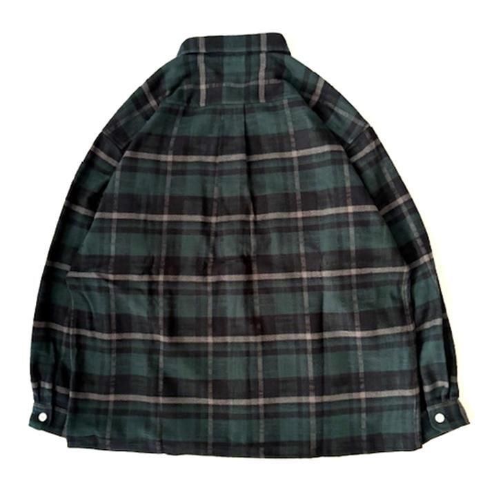 フランネルのようなガサっとした素材感のコットンスラブを使用したチェックシャツ。ゆったりした身幅のボックスシルエット、前身頃の左右に山型フラップポケット、背面にセンターボックスプリーツ。