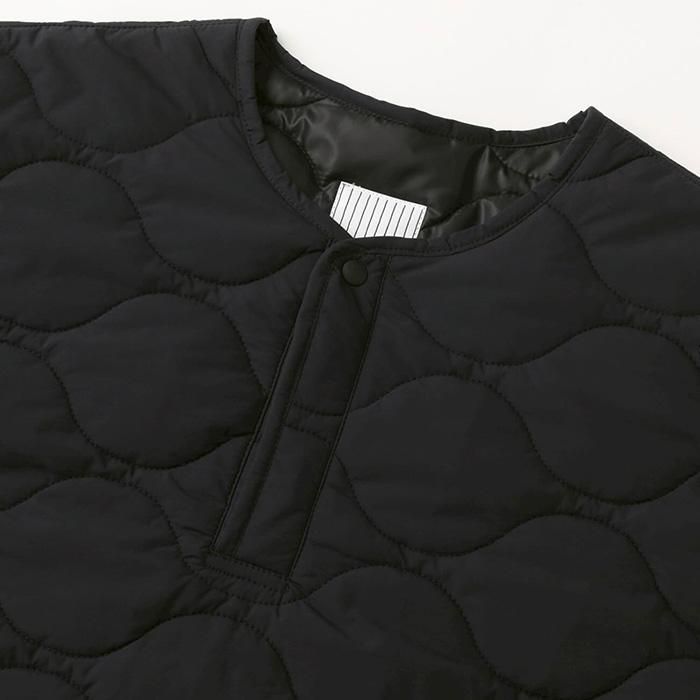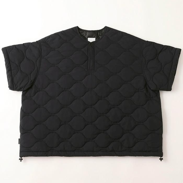 SWEATやニット、またアウターの上から重ね着ができるようにデザインしたビッグサイズの中わた入り半袖プルオーバージャケット。素材は薄手の高耐久撥水性と撥油性を変え備えた高機能ナイロンタスランタフタを使用。内側には膨らみのある軽量の中わたを入れ保温性を持たせています。