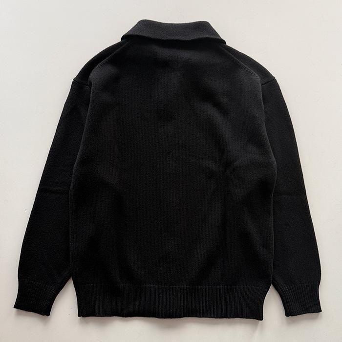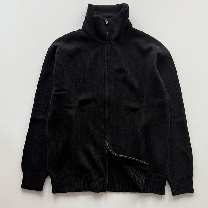 上質なウール、カシミヤ、シルクをブレンドした糸を使用したニット。柔らかくふくらみのある風合いが魅力の7ゲージ天竺編み。 フロントジップ仕様のドライバーズスタイルで、襟は寝かせても自然に収まるつくりが特長。