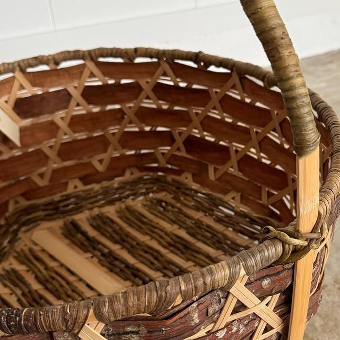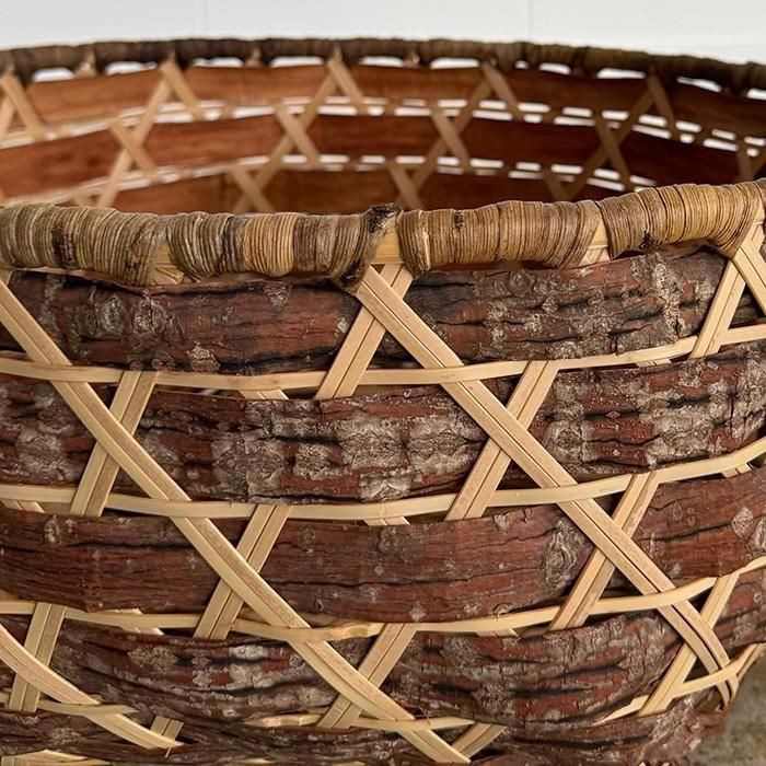 ウリハダカエデの樹皮で丁寧に作られた、日々ノ樹皮籠です。長さのある樹皮が取れた時だけ制作できる特別な大きさの樹皮籠です。