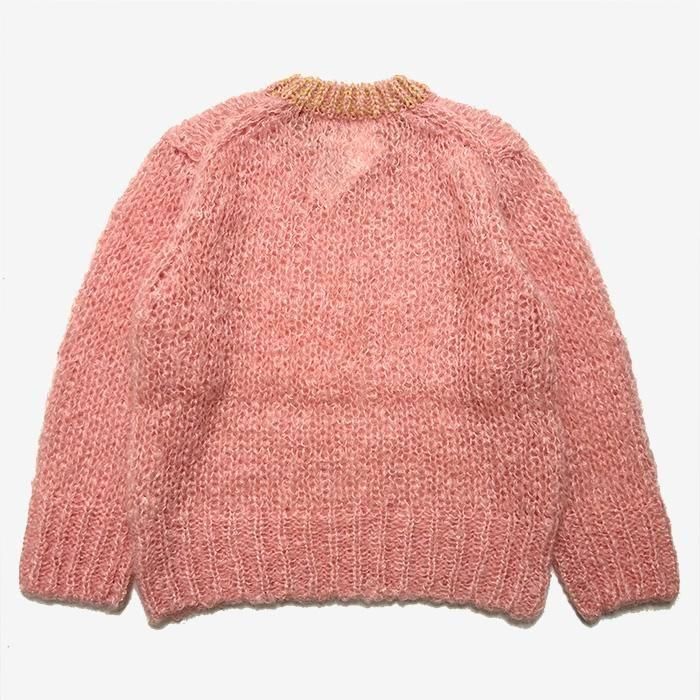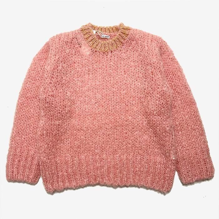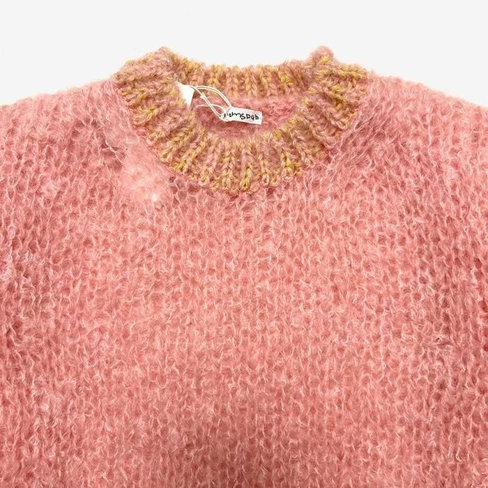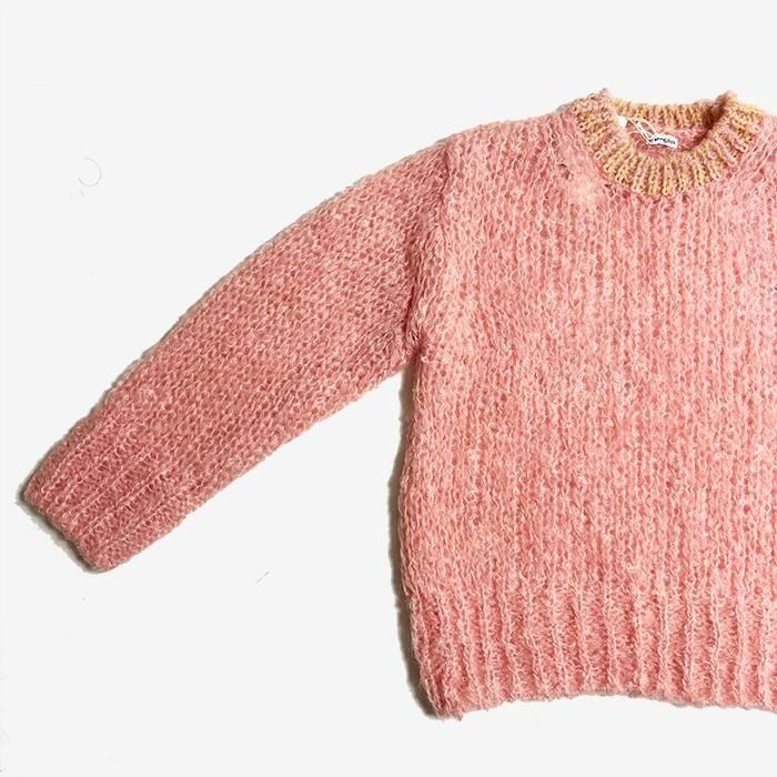 モヘアを贅沢に使ったふわふわのローゲージニット。ふんわり柔らかく軽くて暖かな着心地です。首元のリブに別色がブレンドされているのがポイント。1枚はもちろん、インナーとしてもデザインを楽しんでいただけます。