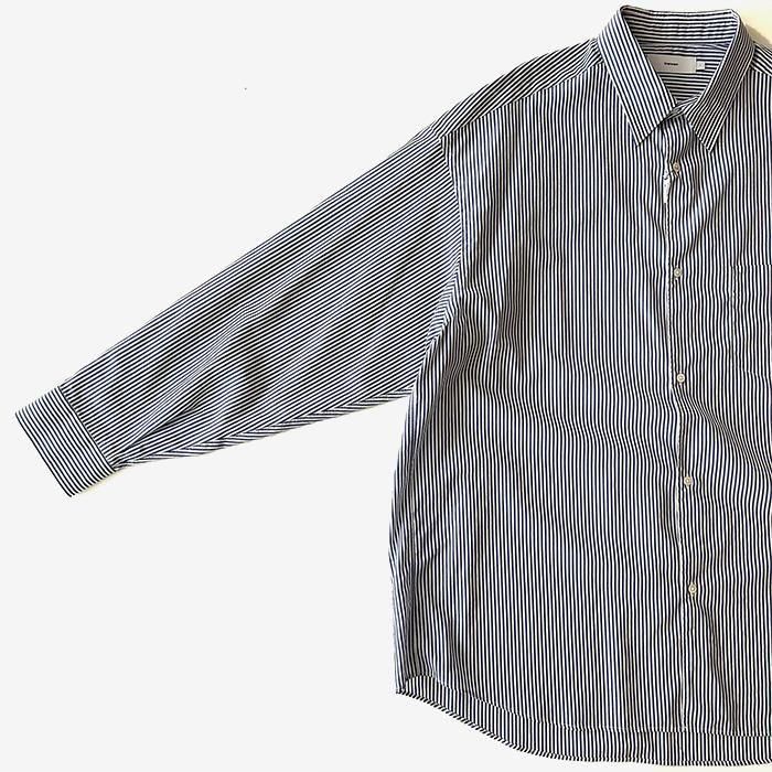 なめらかに整った繊維そのものの光沢感と、均一な撚りにより毛羽立ちにくい超長綿であるスーピマコットン。非常に繊細な糸番手で製織したブロード生地を使用。高級シーツにも使用されている生地で適度なハリと柔らかさがあり着心地が非常に良い。ドロップショルダーでボリュームのあるボックスシルエット。オーセンティックなレギュラーカラー。肩の傾斜や低く下げられたヨークの位置、アームホールの広さなど、細かなディテールを特異なバランスで仕上げたビッグシルエットが特徴。