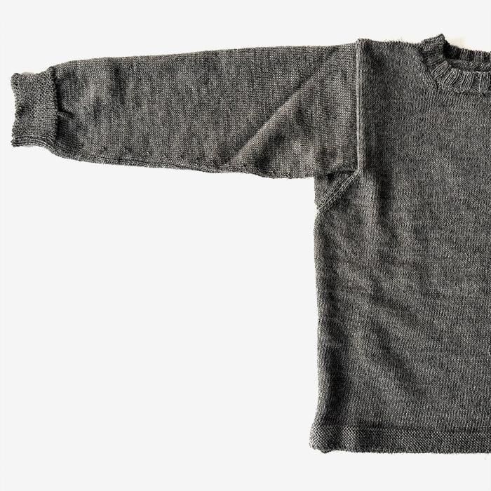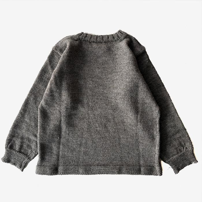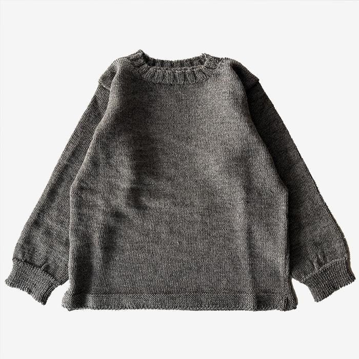 イギリスのガンジー島で、漁師が作業着として着ていたセーターです。 夜明けの薄暗い甲板の上でも前後ろを間違いなく着れるように、そもそも前後ろの区別のない直線的なデザイン。脇の下の三角のマチや、裾のスリットなど、力強く大きく体を動かしても問題ない作りになっていることからも、このセーターが労働者のためのものだったことが感じられます。 当時は海で働く家族のために手編みで作っていたガンジーニット。当時のディティールを再現するために、古い家庭用の手編み機を使って、職人が時間をかけて編み込んでいます。