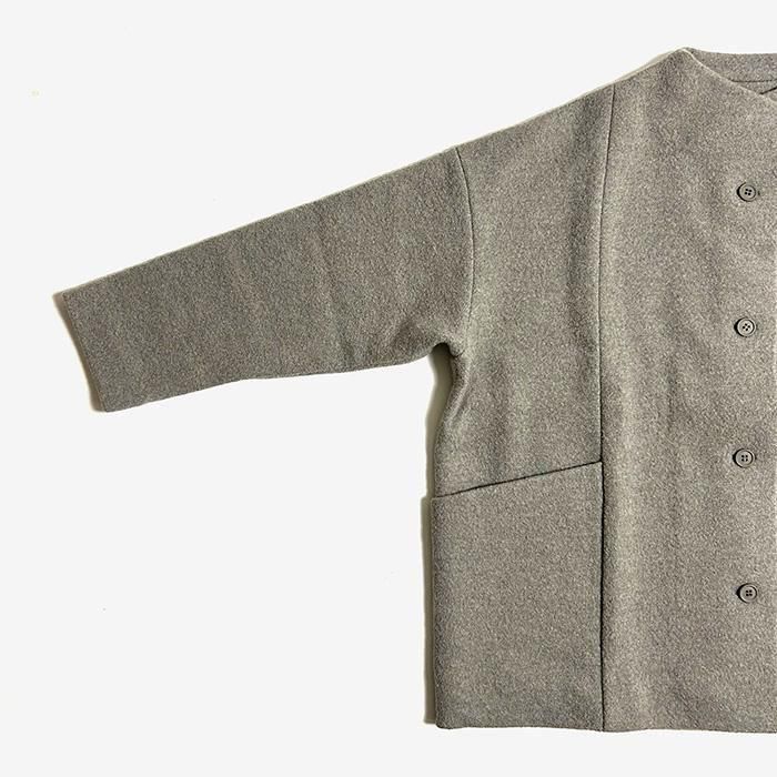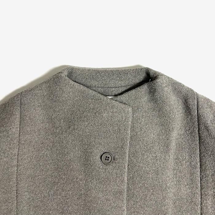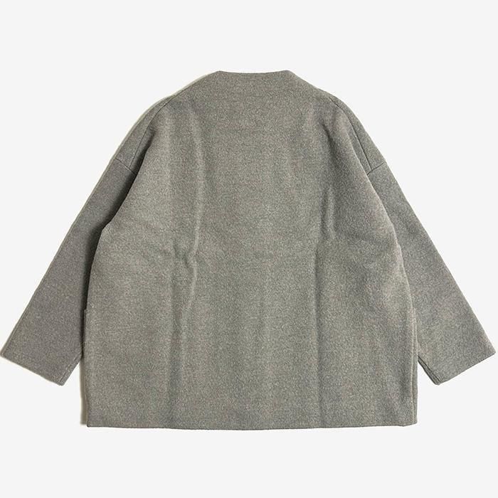 evam eva 定番のプレスウールシリーズ。柔らかなウール糸で編んだニット地を圧縮することで、しっかりとした生地に仕上がります。レディース・メンズのアイテムを問わず幅広いコーディネートをお愉しみいただけます。ゆったりとした着心地のショートコートは気軽に着ていただけるデザインながら少し立ち上がったネックラインが上品な印象です。
