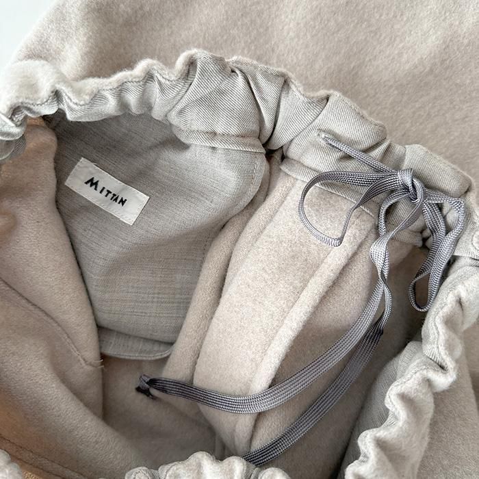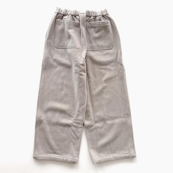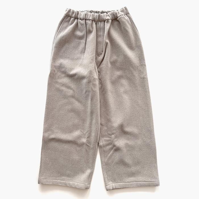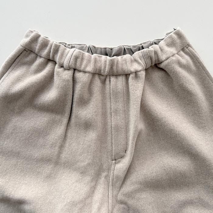 オーストラリア産のラムウール、Super100原料を使用したモッサ(紡毛織物を縮絨後、起毛整理した生地)を使用しています。補強の為のナイロン等の化繊が全く入っておらず非常に柔らかな風合いで、着用による経年変化においても化繊混の生地と比べて硬い毛玉はできません。ストンとストレートに落ちるシルエットで、ゆとりのあるワイドなデザインです。ウエスト部分にはゴムと内側の紐が付いており、ベルトを使わずに着用することができます。インナーを調整する事で多くの季節で着用が可能です。
