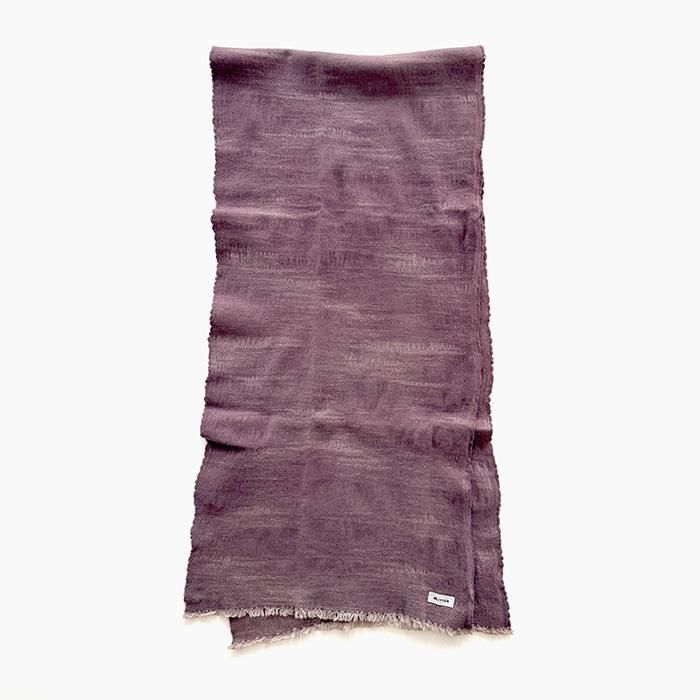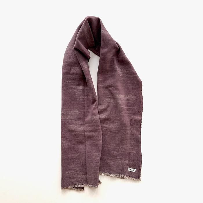 緯糸は南米ウルグアイのウルグアイ産の平均繊度15.5マイクロンの超極細メリノウールを経糸にはアメリカ産の綿を中国で紡績した綿糸を使用して、綾織の表裏で絣調の柄を表現したオリジナルの生地です。デニムの表裏で色が異なるように、経糸が多く見える面と緯糸が多く見える面を柄状に切り替えることで柄を表しています。経糸に細い綿糸を使用していますが、実際に肌に触れるのはカシミヤと同じくらいの繊維の細さのウールとなっている為とても柔らかく、肌への負担もほとんどありません。経糸の綿糸が支える事でより柔らかな織りが可能となっていて、緯糸自身と織りの中にそれぞれに空気を十分に含ませる事で暖かさを維持できます。通常の工業製品と異なり、製織後にカット・縫製した後に一枚一枚縮絨をかけることで、それぞれに違った表情が生まれています。生地幅も場所によって一定では無い為、よりウールが縮絨するという自然の工程を体感していただけます。通常のストール使いの他にも肩にかけて使用することができます。