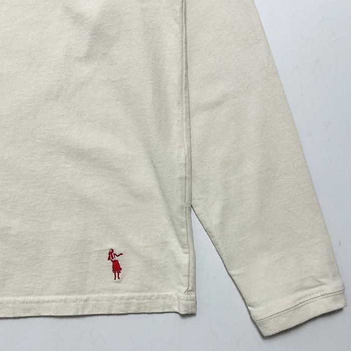 長袖のTシャツでございます。本体のお色はO.WHITE、黄文字で前身頃に『HONEY』後身頃に『BEE』。前身頃、左下にフラガールの刺繍が施されています。