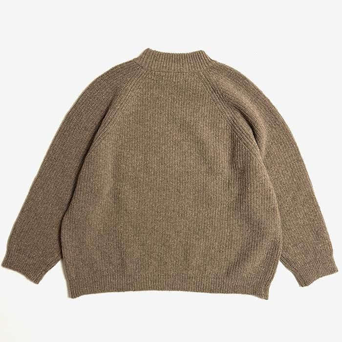 畦編み特有の立体的なボリュームを活かした、身幅にゆとりをもたせたシルエットです。インナーとしてはもちろん、アウターとして中に厚手のレイヤリングをしても窮屈さを感じさせず、秋冬の着こなしに柔軟に対応します。日常の道具としての機能性を意識しています。