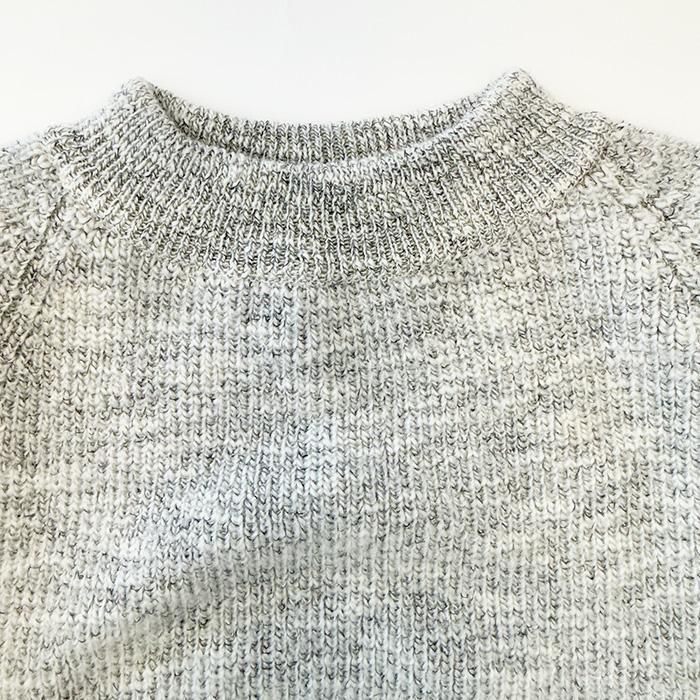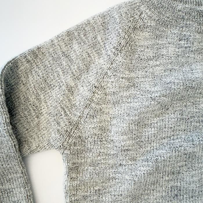 南米ウルグアイ産のノンミュールジングウールを太番手のスラブ糸に紡ぎ、リブ部分を除いて全体を畦編みで仕上げています。スラブ糸の嵩高性により、ざっくりとした表情ながら軽やかなボリュームを実現しています。ミュールジング(羊の臀部の皺に病原虫が付着するのを防ぐため、無麻酔で皮膚や肉の一部を切除する行為)を行わない原料を採用し、羊への負担を軽減しています。